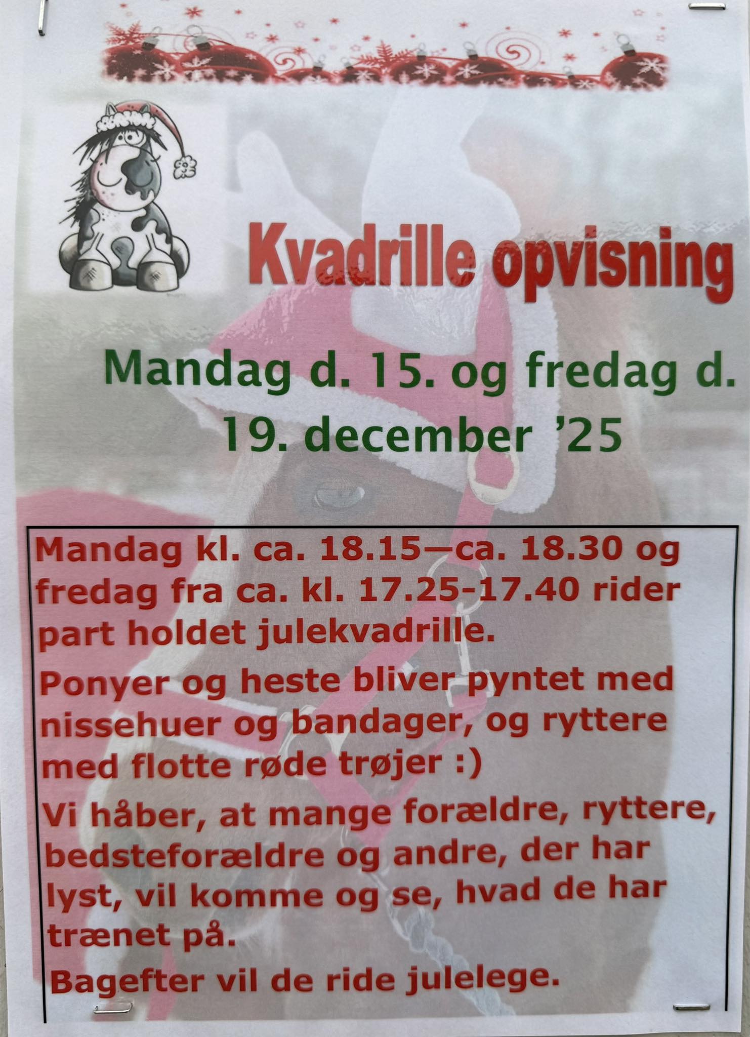 På fredag d. 19/12 viser ½ parterne en julekvadrille som de har øvet sig på kl. ca. 17.25.